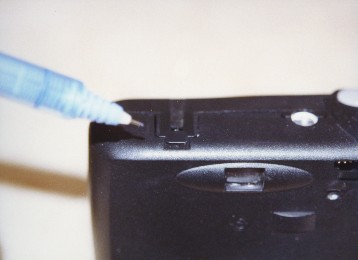 However, we have modified the film advance wheel to accept films with two notches. "Where on earth can you find these film cans," you ask. Luckily, you can easily cut these two notches on a normal 35mm film can with your cutter.