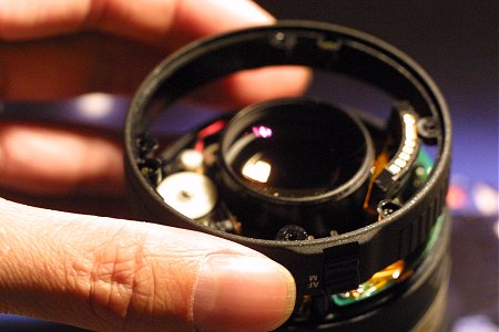 Step 7: Remove the rear lens body ring carefully. This piece contains the AF/MF switch, which is mechanically connected to the mechanical gears and an electrical switch. Be careful not to break or bend any parts.